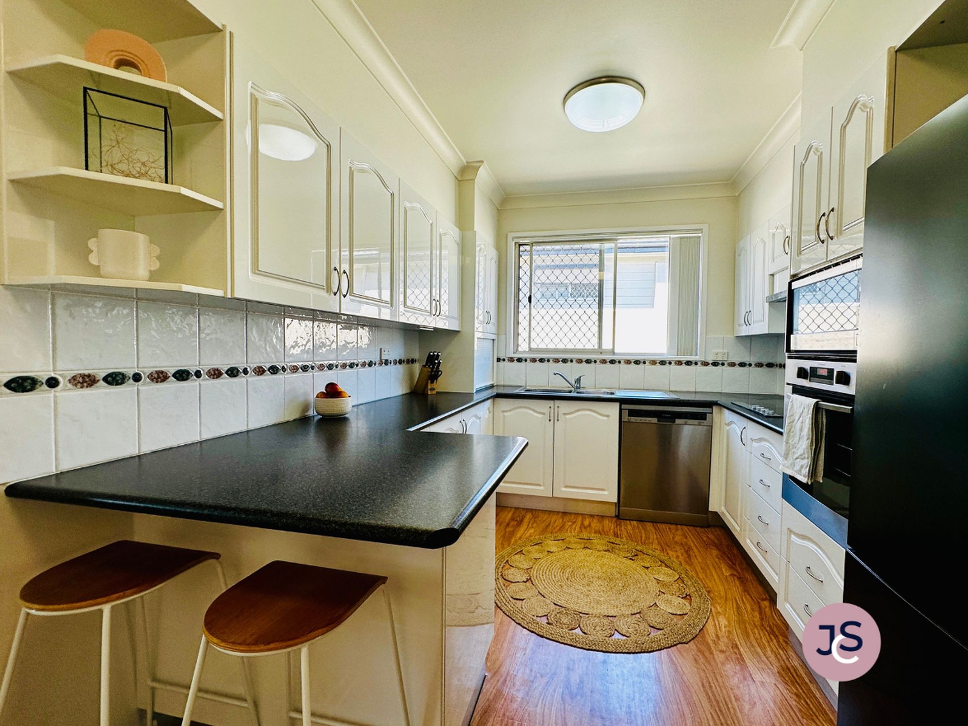 -Well equipped kitchen with modern amenities, including a dishwasher and breakfast bench